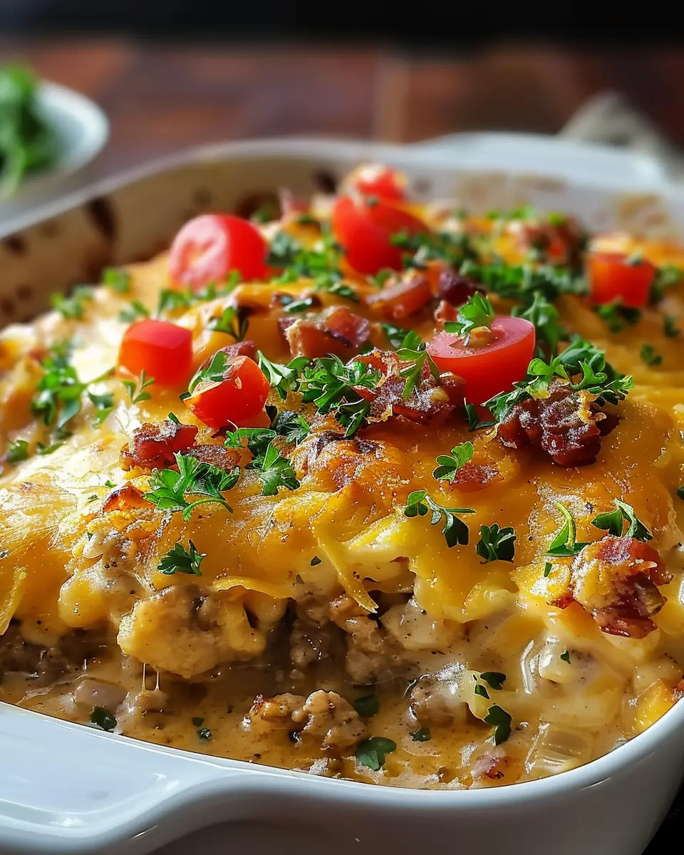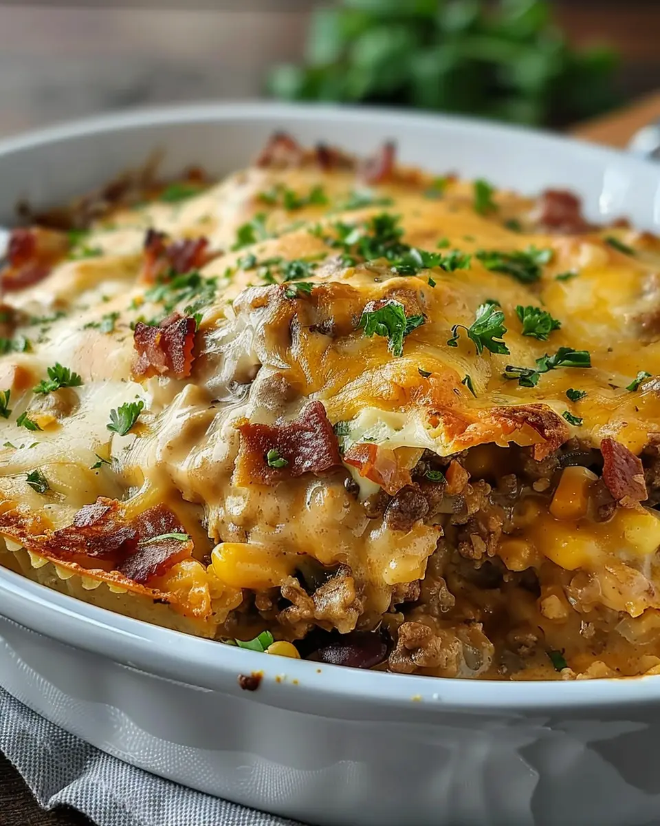 Cowboy casserole is more than just a meal; it’s a comforting hug on a plate. This dish combines the heartiness of ground beef, Turkey bacon, and chicken ham with the creamy goodness of shredded cheese and a crispy topping, making it a surefire crowd-pleaser.
