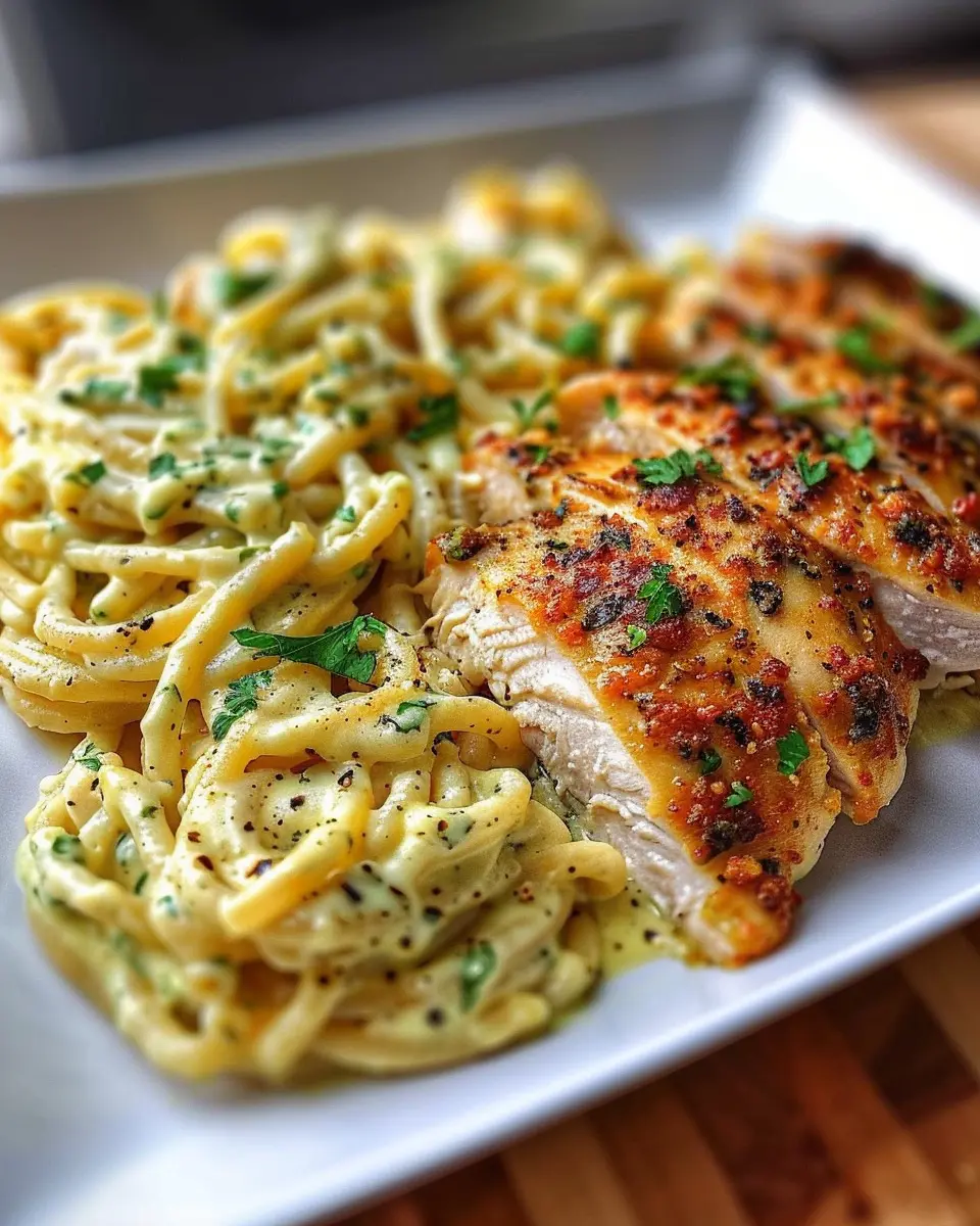• Serve your creamy garlic parmesan chicken pasta immediately, garnished with a sprinkle of chopped parsley or additional Parmesan for that eye-catching presentation.