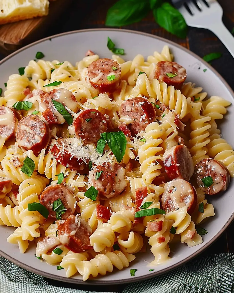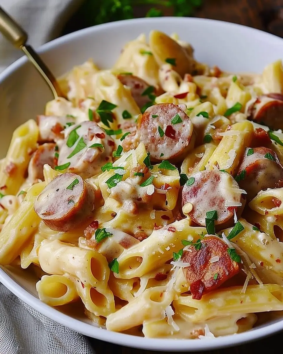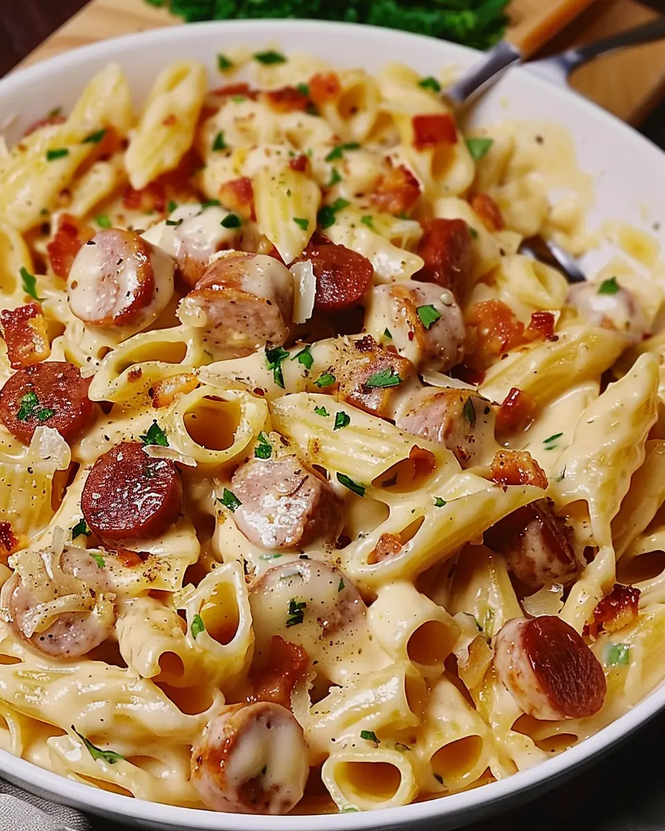 A deliciously creamy pasta dish featuring mozzarella and smoked sausage, perfect for a comforting meal.