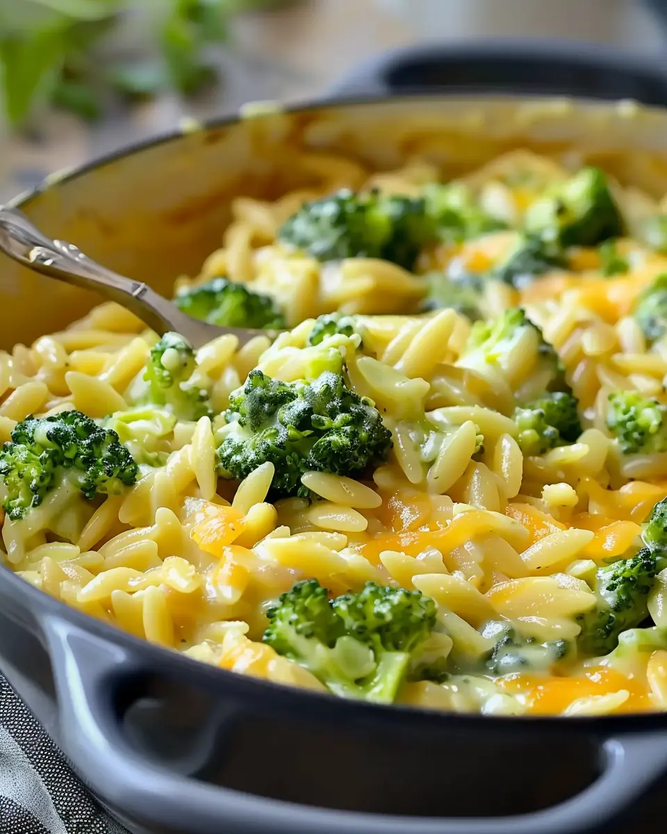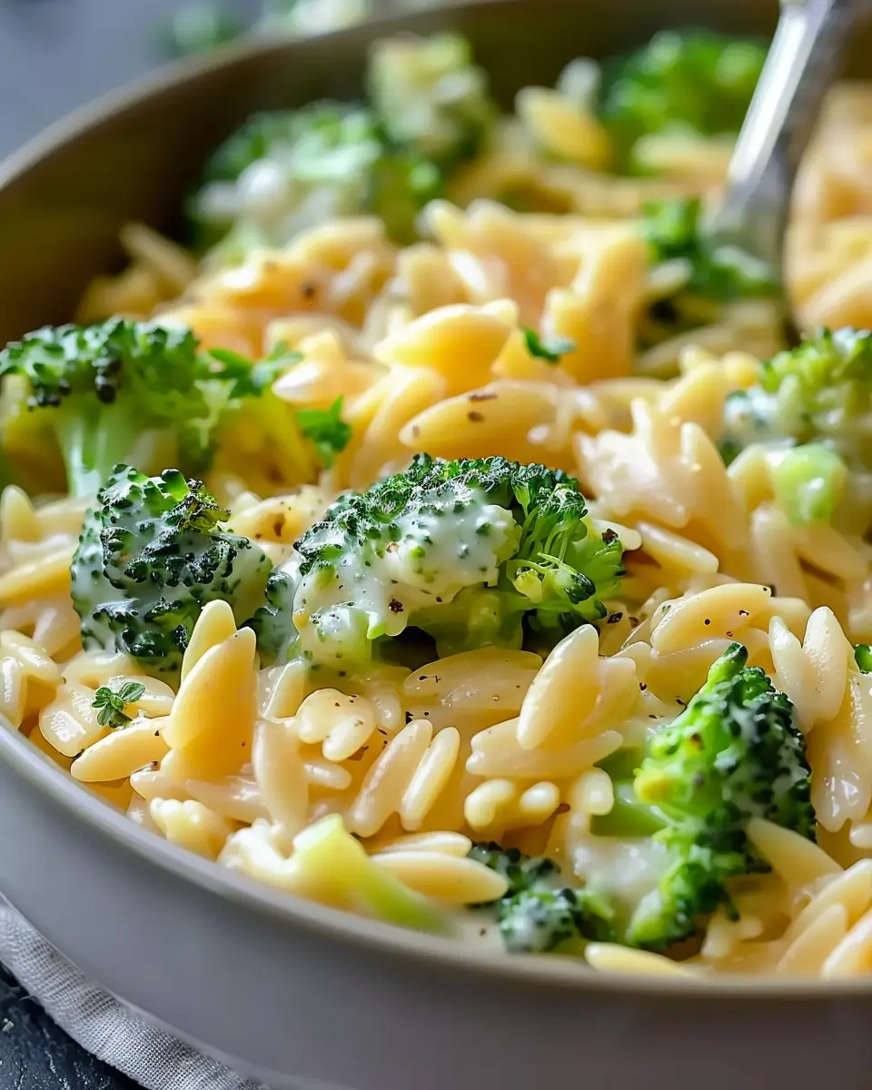 A rich and creamy dish featuring orzo pasta, broccoli, and cheddar cheese, enhanced with turkey bacon for a delightful taste.