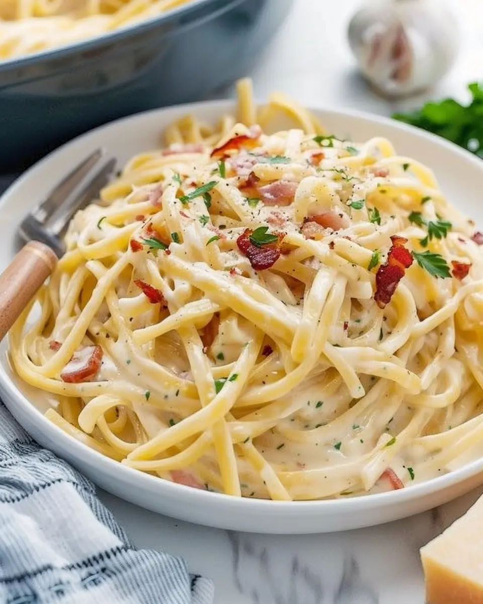 Indulge in a creamy, savory pasta dish featuring turkey bacon, perfect for a cozy meal.