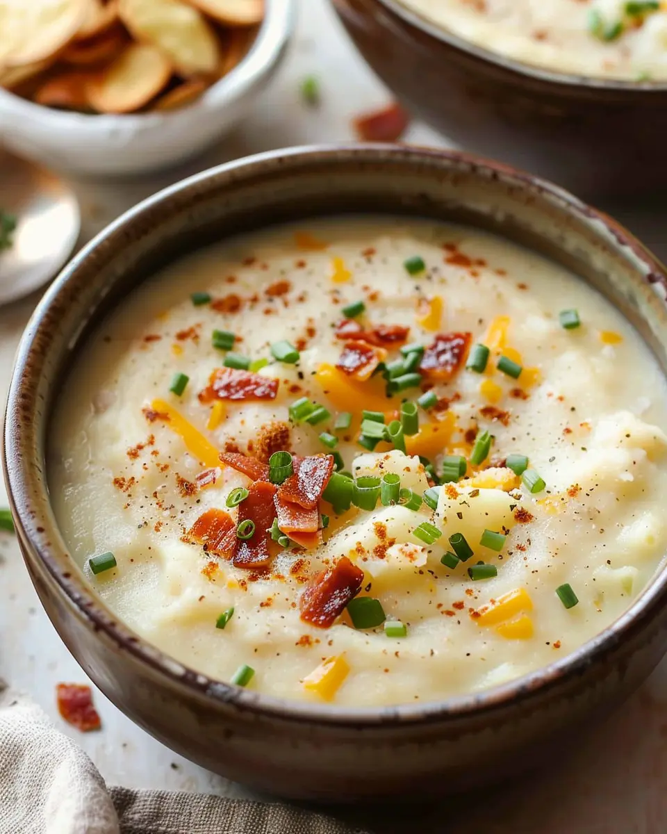 If you’re a cheese lover, this version of easy baked potato soup will be your new favorite. To transform your classic soup into a cheesy delight, simply add a generous amount of shredded sharp cheddar or Gruyère when you’re blending it all together. For an extra touch, toss in sour cream and chives before serving. You might also consider topping it with crispy Turkey Bacon bits for that delicious crunch. A combination of flavors that tantalizes your taste buds!