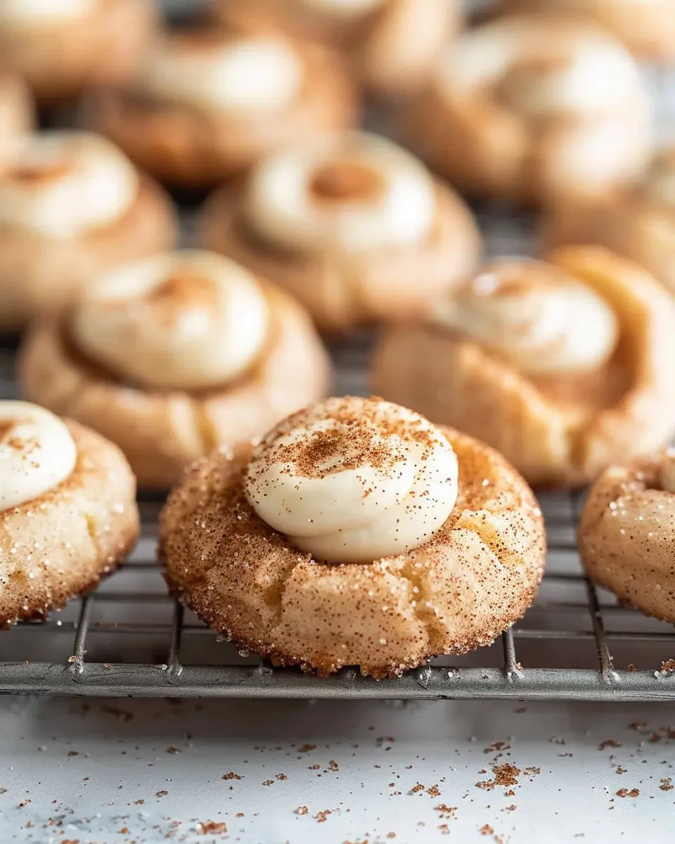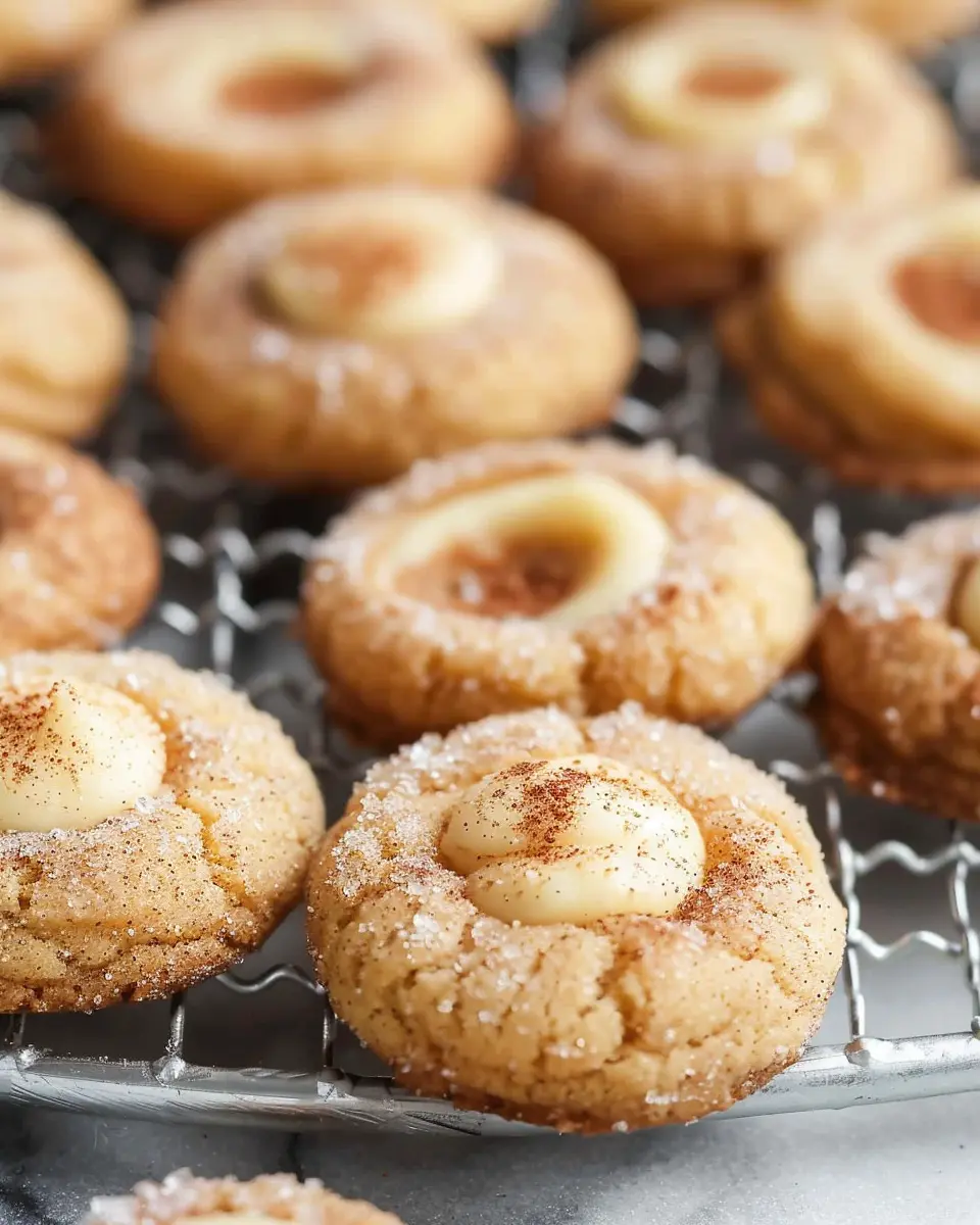 Indulge in the festive flavors of Eggnog Snickerdoodle Thumbprint Cookies, perfect for holiday gatherings.