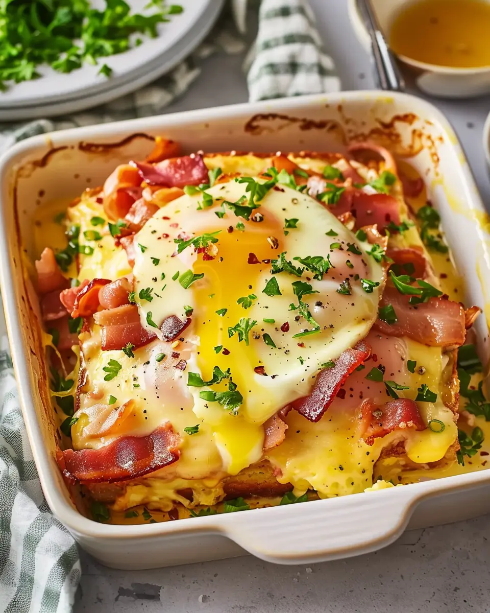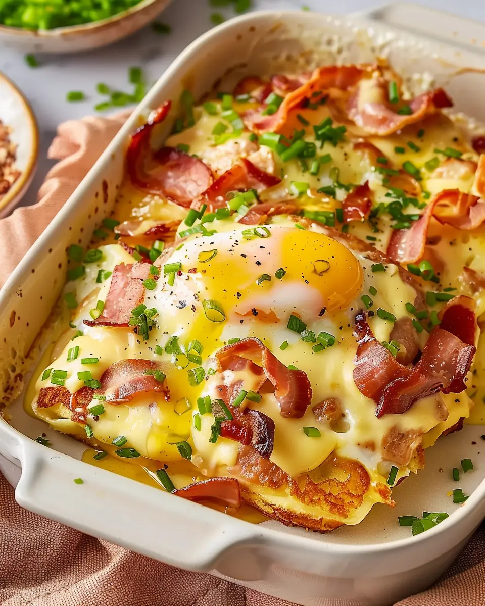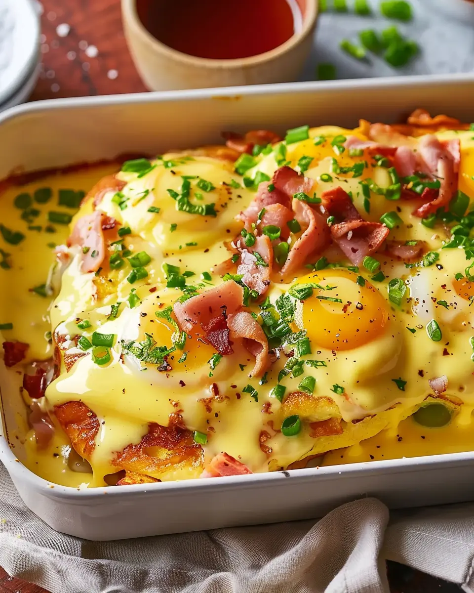Enjoy a delightful twist on a classic breakfast dish with this Eggs Benedict Casserole featuring turkey bacon and chicken ham.