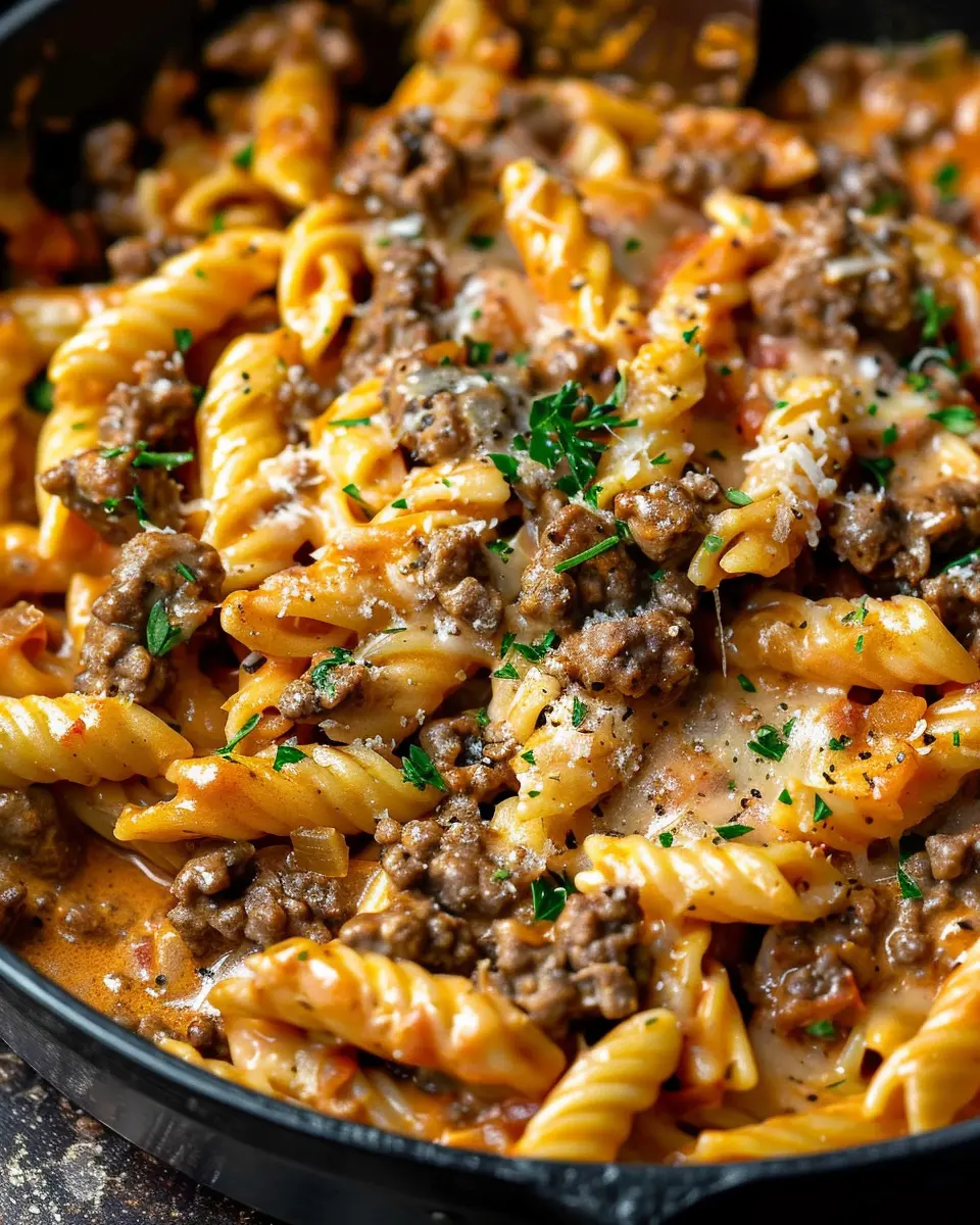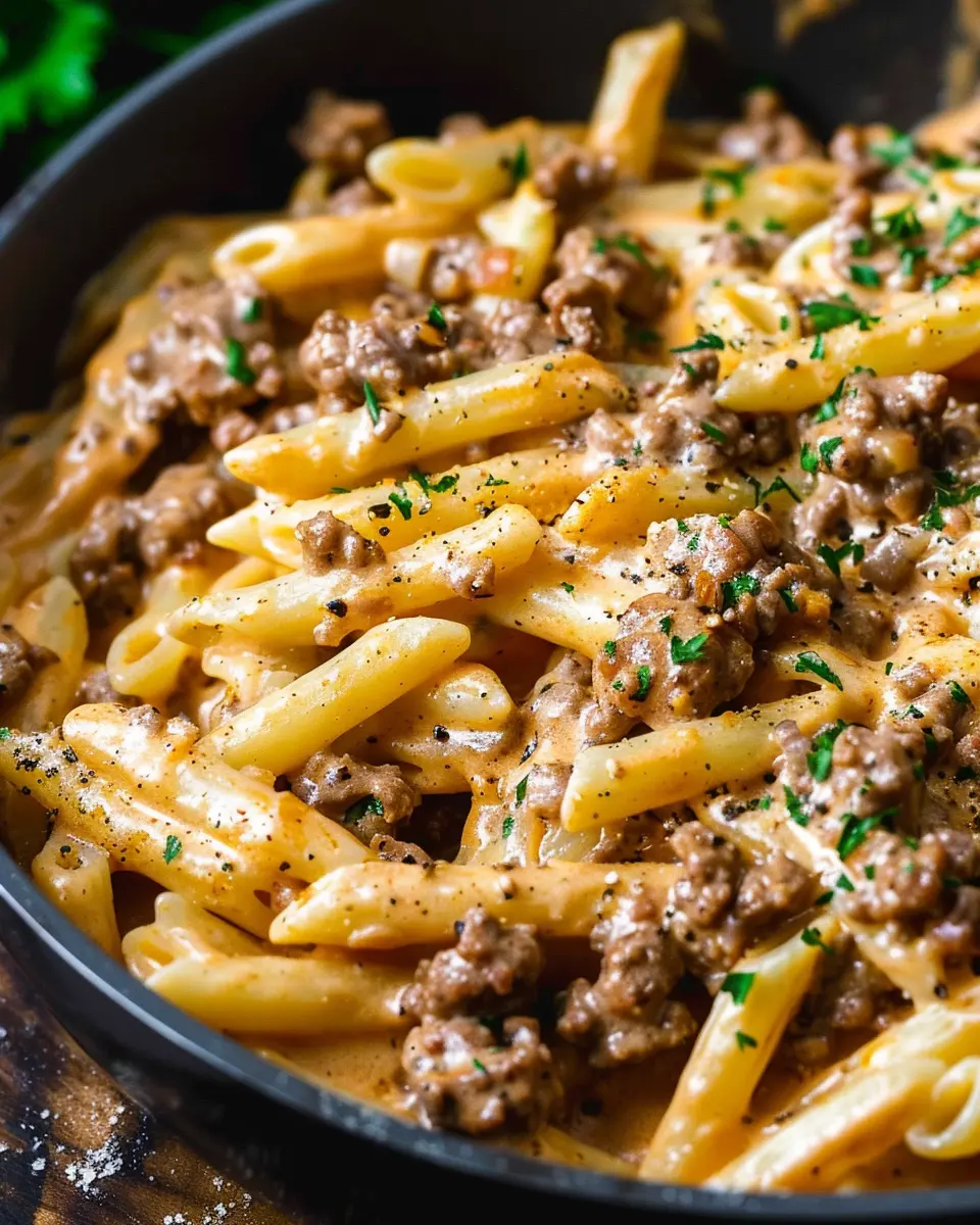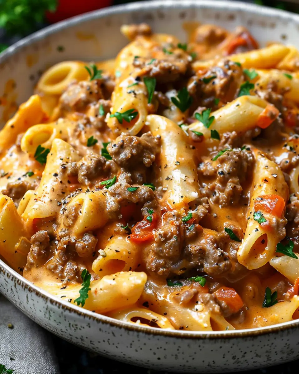 Now comes the final flourish! Add in your drained pasta and thoroughly mix it into the beef and creamy sauce. This is where the magic happens! All those flavors meld together into a creamy, satisfying dish. If you find it too dry, feel free to use more reserved pasta water until you reach that creamy perfection you’re looking for. Serve it hot, topped with fresh herbs or an additional sprinkle of cheese for the ultimate comfort food experience.