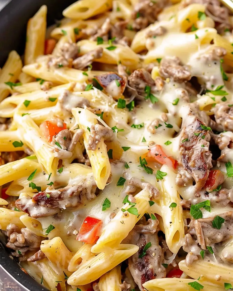 And just like that, you have a complete dish that captures all the delightful flavors of a classic Philly cheesesteak in a comforting pasta format!