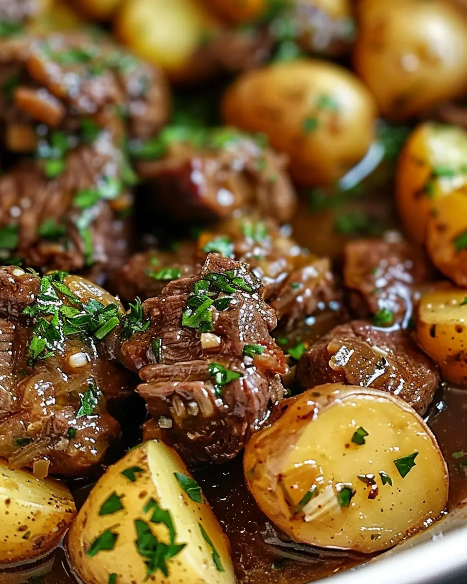 A delicious and easy slow cooker recipe that combines tender beef bites and potatoes in a rich garlic butter sauce.