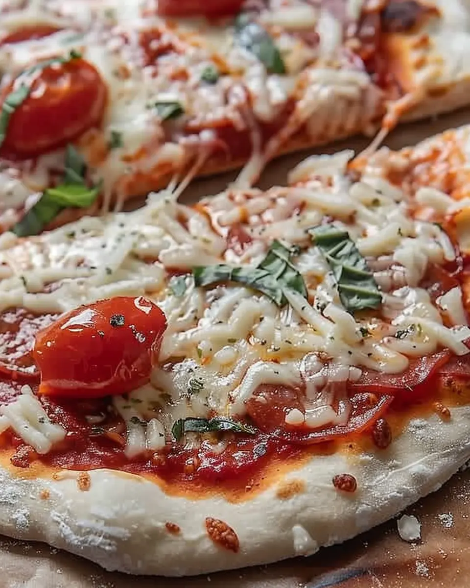 Once your dough has relaxed, flatten each ball into a pizza shape on a floured surface. Don’t be afraid to stretch it out—this is half the fun! Top your pizza with your favorite ingredients—think tomato sauce, cheese, turkey bacon, roasted vegetables, or even chicken ham. The sky’s the limit!