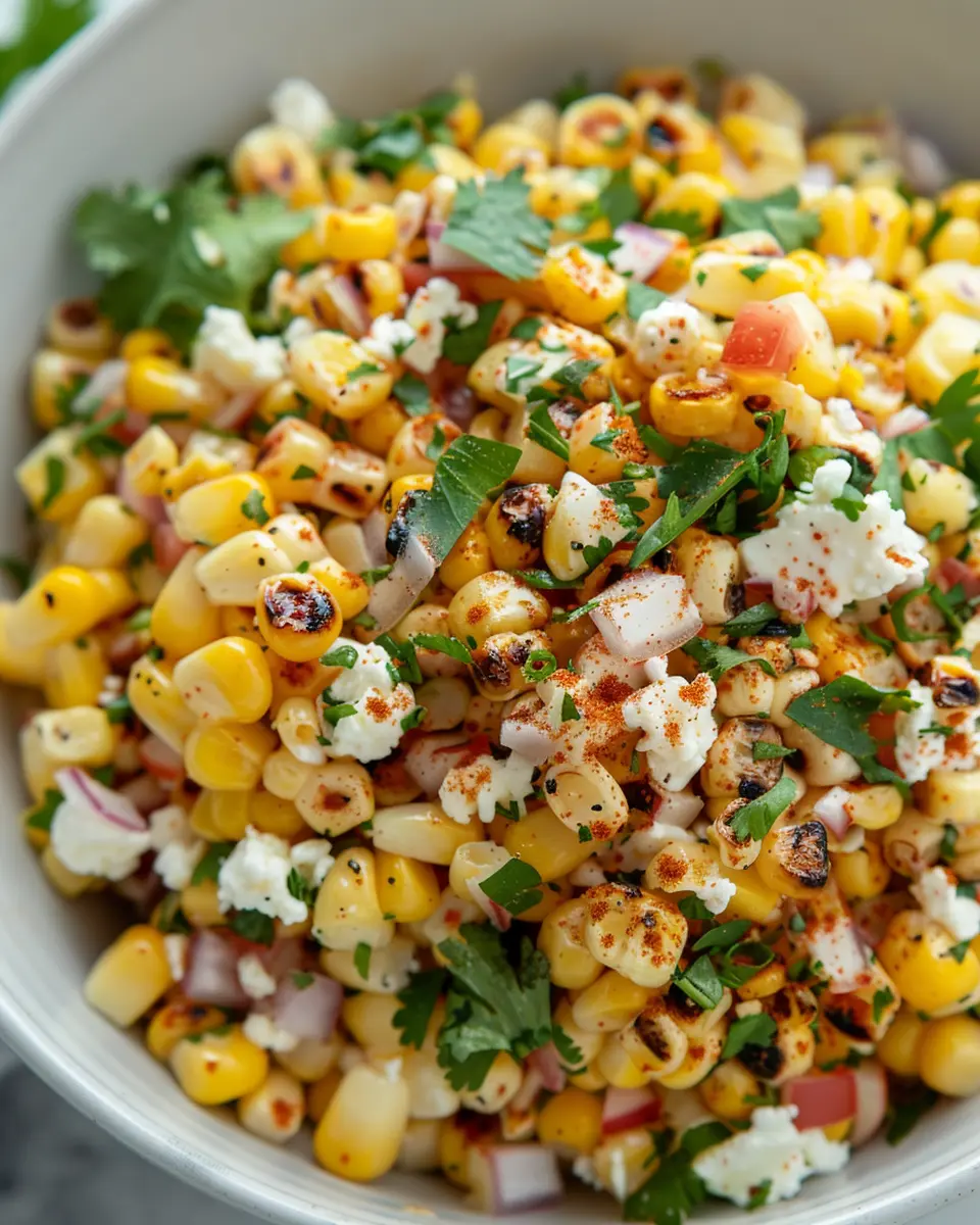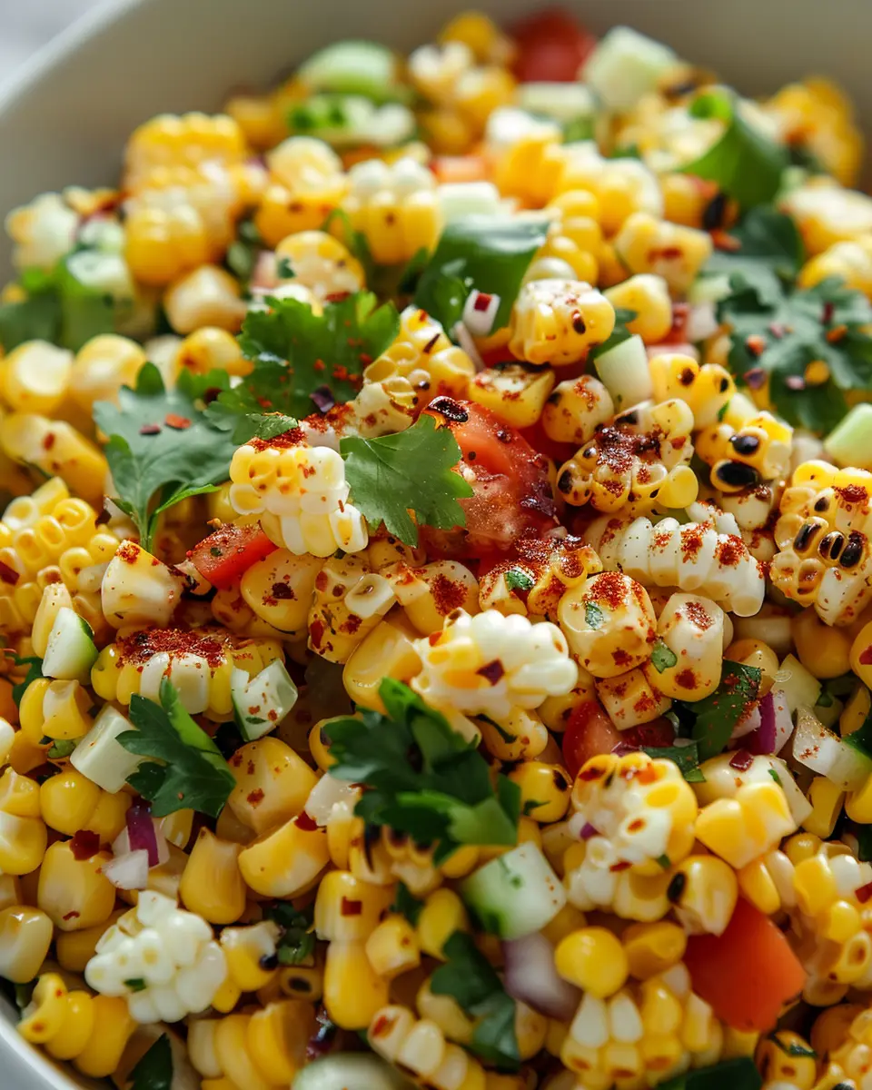 Transport your taste buds with a Mediterranean version of summer street corn salad. Mix in diced cucumbers, cherry tomatoes, Kalamata olives, and crumbled feta cheese. Drizzle with a simple olive oil and lemon vinaigrette. This variation is not just vibrant and colorful; it adds a punch of flavor that celebrates the freshness of Mediterranean ingredients, perfect for a summer gathering or a light lunch.