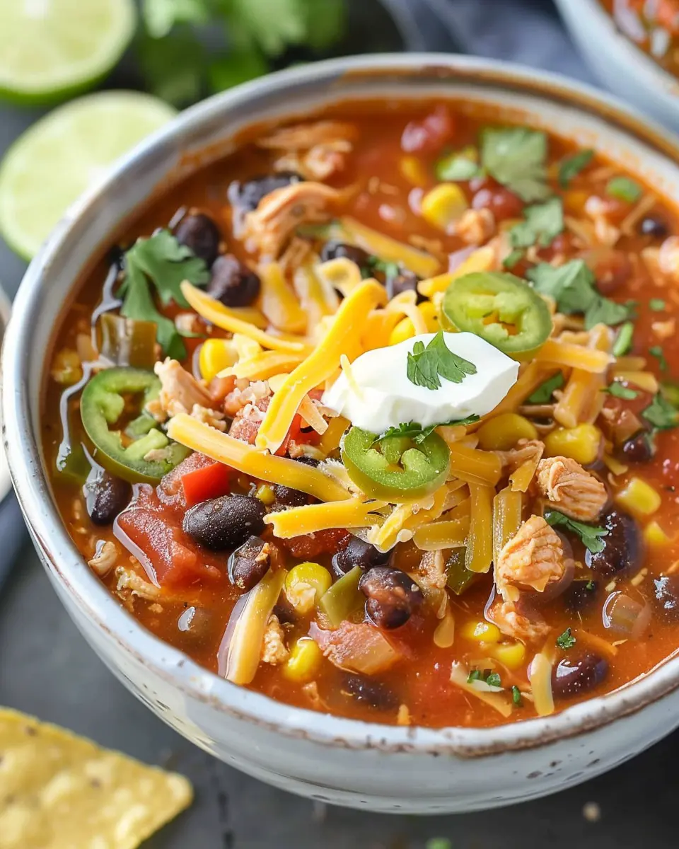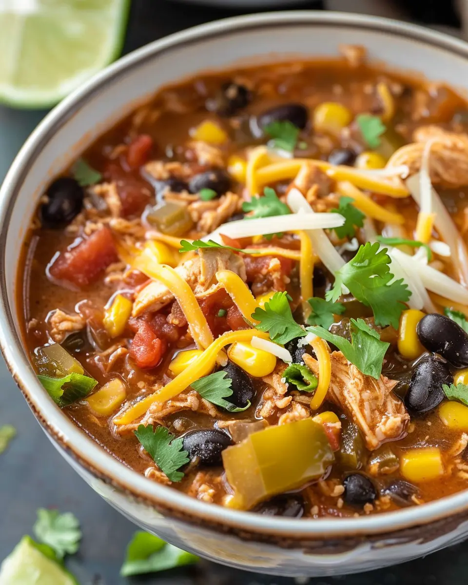 A delicious and easy taco soup recipe made with chicken, perfect for a cozy meal.