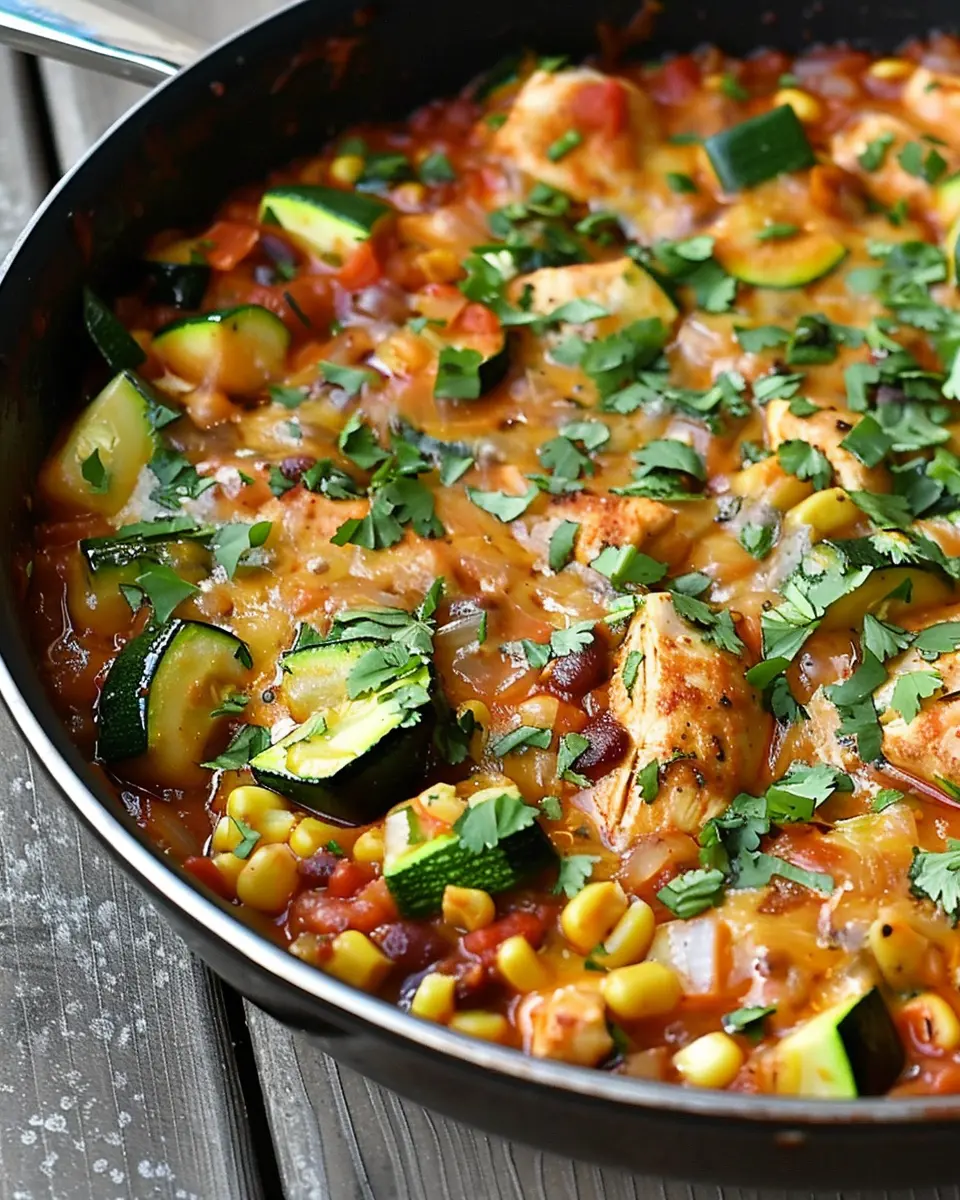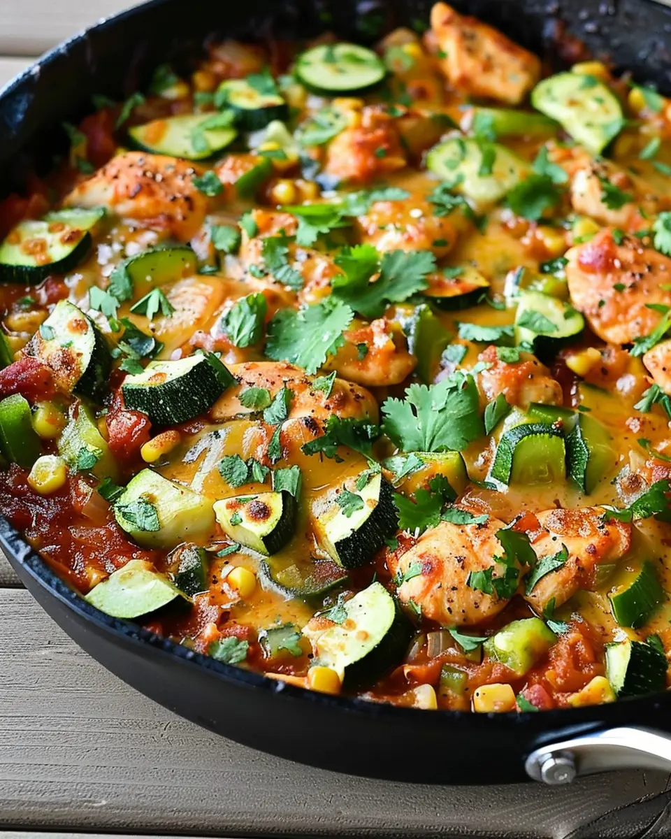 A delightful and easy-to-make one-skillet meal that combines Tex Mex flavors with fresh zucchini and chicken.
